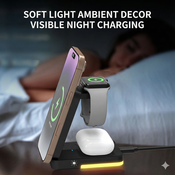 [3 in 1 Wireless Charging Station] : Designed for users of Apple products, wireless charging allows you to charge for iPhone and Apple watch & Airpods simultaneously with just one cable. With a built-in wide-range induction coil and wireless charger technology, it brings you an easy and convenient charging experience without the hassle of cluttered wires. Note: Please remove the phone case when charging the iPhone to avoid affecting the charging.