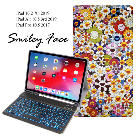 OZADE iPad 7th Generation Case with Keyboard 7 Colors Backlit Detachable Keyboard Leather Folio Smart Cover Built-in Pencil Holder for iPad case 10.2/iPad Air 3 10.5/iPad Pro 10.5,Smiley Face